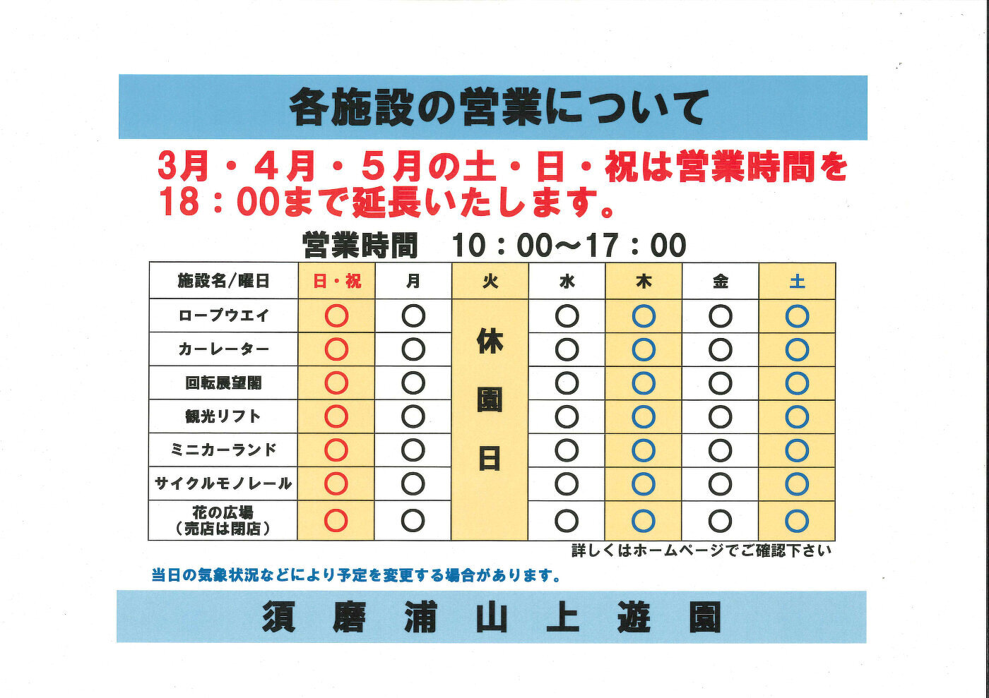 2026年3月1日(日)から5月31日(日)までの営業について(2026年3月1日(周日)至5月31日(周日)的营业时间) バーベキューにつきまして 運賃・料金の改定について コース券所要時間について 各種優待割引の終了について 自家用車でのご来園予定のお客さまへ 須磨浦山上遊園ご利用のお客さまへ お子さまと観光リフトご利用のお客さまへお願い ご来園時には滑りにくいお履き物でお越しください。