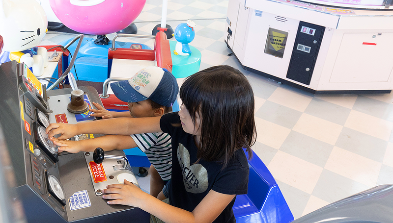 昭和33 年に営業をスタートした回転展望閣は、須磨浦山上遊園のシンボルであり、園内を遊び尽くすための拠点でもあります。3 階の回る喫茶店が有名ですが、2 階のゲームコーナーも知る人ぞ知る穴場スポット。少し懐かしさを感じるアクションゲームやクレーンゲームが並び、そのほとんどを100 円で遊ぶことができます。また、流行当時と同じ形で残るレトロなスペースインベーダーゲームも人気です。